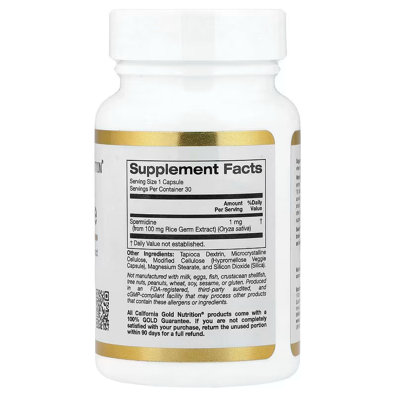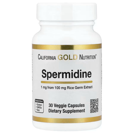 La espermidina de California Gold Nutrition® es un suplemento de longevidad puro y de baja dosis, formulado a partir de extracto de germen de arroz (Oryza sativa) . La espermidina es una poliamina natural que ha recibido gran atención en la investigación sobre el envejecimiento saludable y la salud celular por su papel en el mantenimiento de las vías normales de renovación celular.*