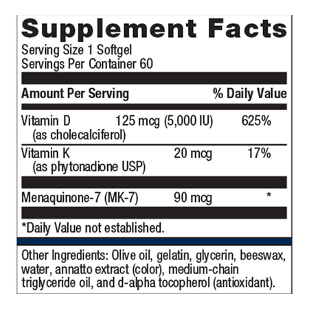 Vitamin D3 5000 + K de Metagenics es una fórmula de vitamina D de alta potencia diseñada para apoyar la salud ósea, la función cardiovascular, el apoyo inmunológico y el metabolismo del calcio .