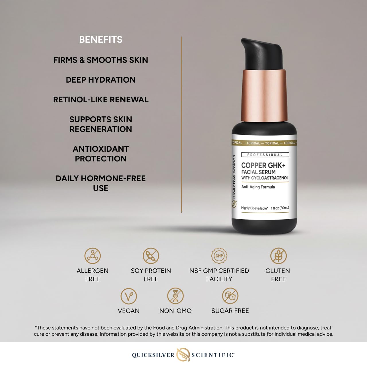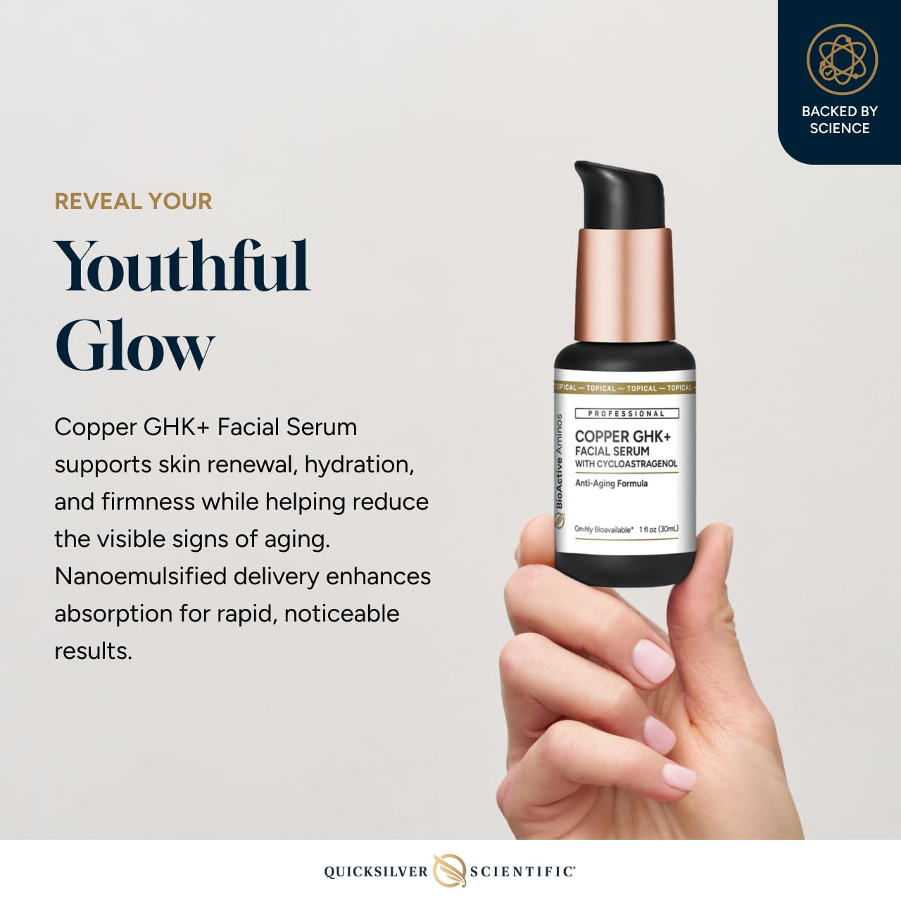 Quicksilver Scientific Copper GHK+ Facial Serum with Cycloastragenol is a premium, nanoemulsified cosmeceutical designed to support healthy, resilient, and youthful-looking skin. This advanced facial serum combines copper tripeptide GHK-Cu with clinically relevant botanical and antioxidant compounds to support skin repair, hydration, and overall skin vitality.