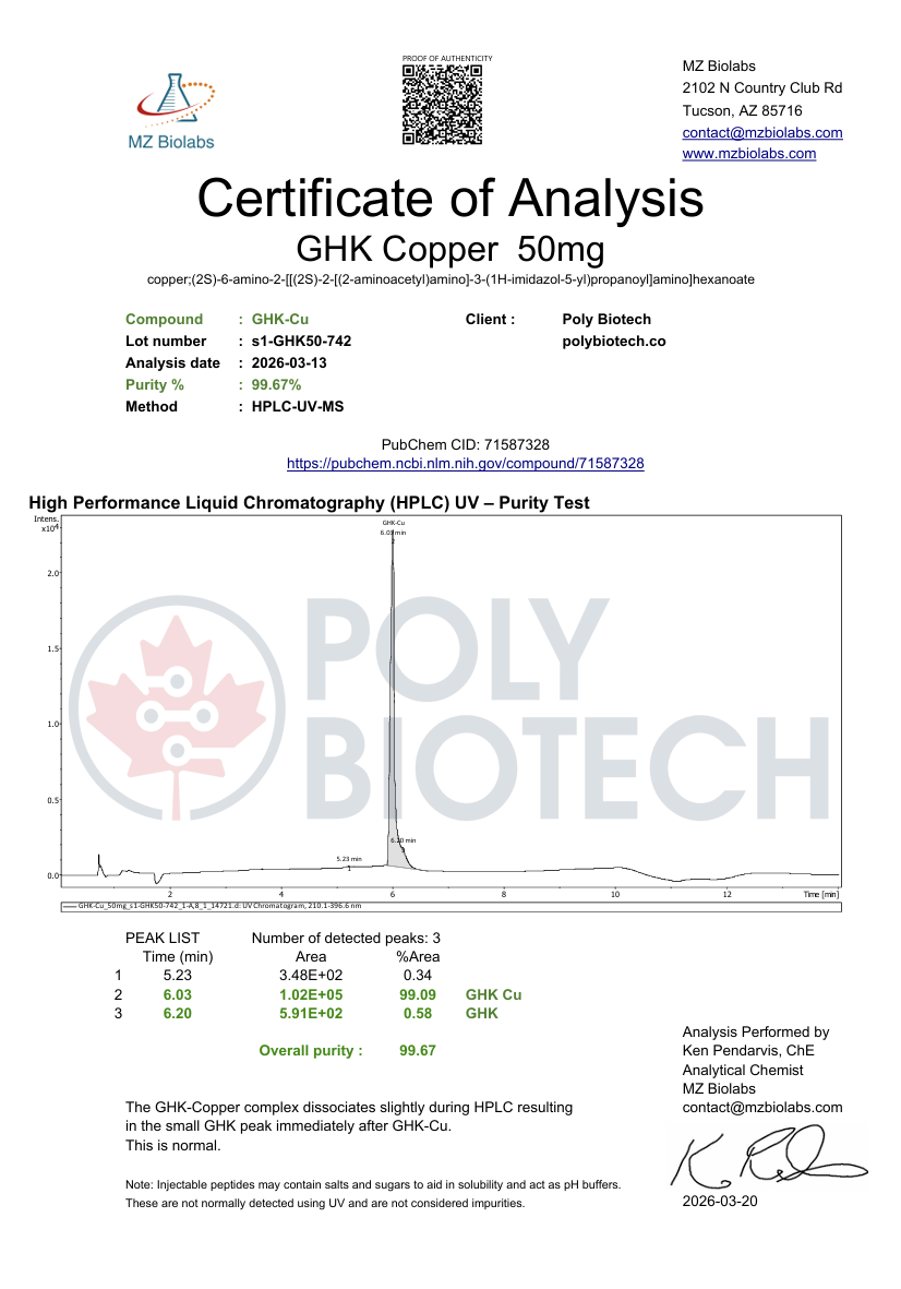 Poly Biotech provides high-purity GHK-Cu peptides in Colombia, produced under controlled laboratory conditions and handled in sterile environments. Each vial is tamper-evident, clearly labeled, and batch-tracked to ensure precision and consistency in advanced research applications.